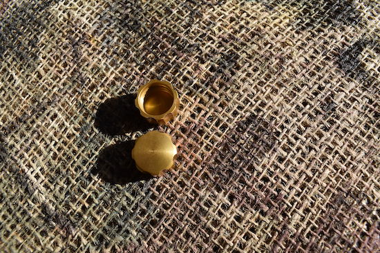 CUSTOM MADE GOLD ANODIZED CAST CONTROL KNOB AND 304 STAINLESS STEEL HANDLE NUT WITH LOCKDOWN 18-8 SS SET SCREW.